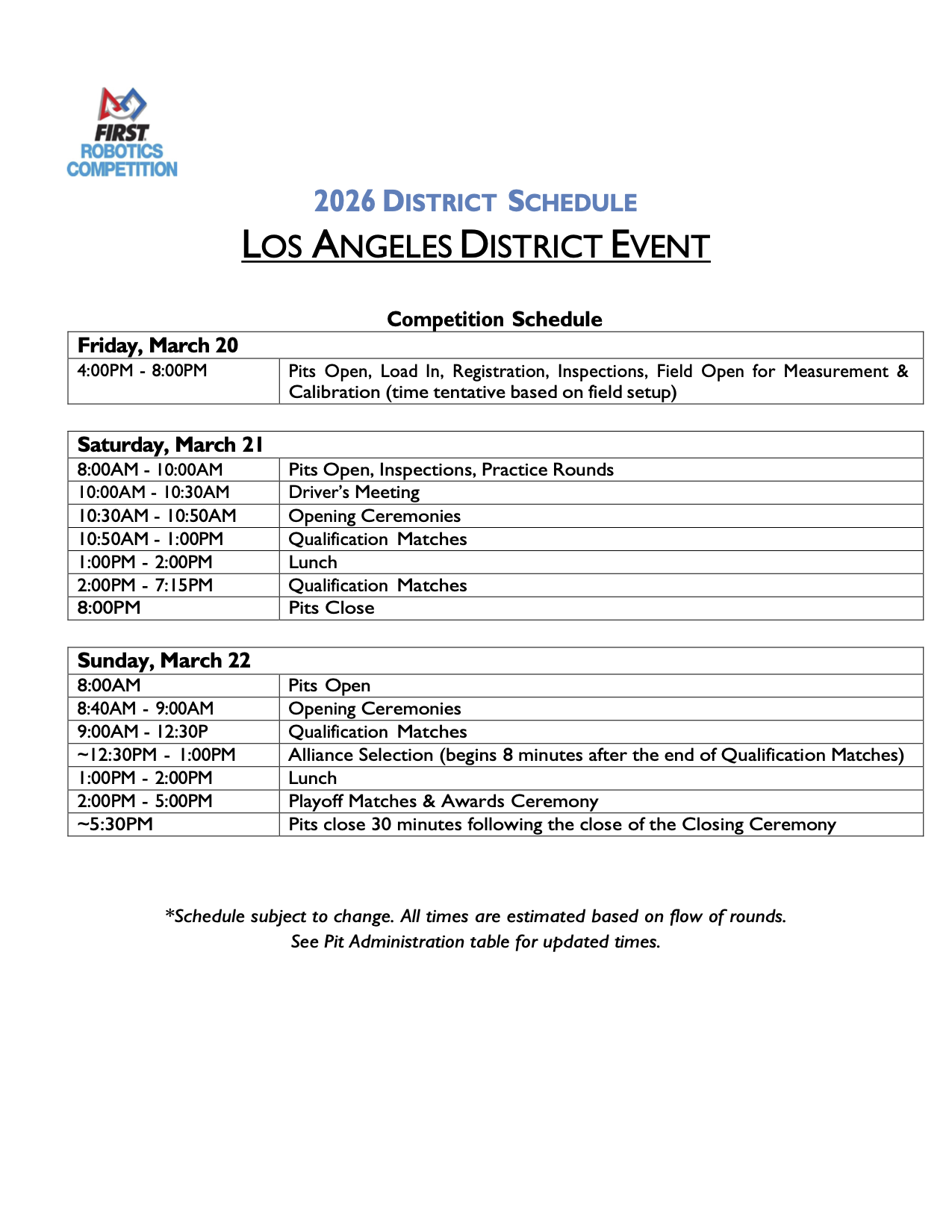 Spectators welcome March 21-22, 2026! Catch the excitement of this intense competition, tour the pits to visit with teams and robots, and cheer on their favorite teams. Admission is free.